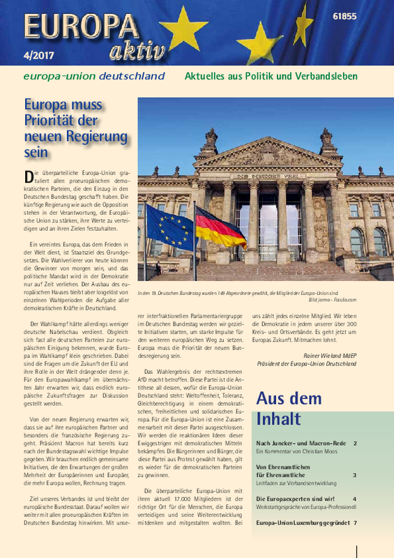 Die aktuelle Ausgabe unseres Mitgliedermagazins steht im Zeichen der Bundestagswahl und der Initiativen von Jean-Claude Juncker und Emmanuel Macron zur Weiterentwicklung der Europäischen Union. Außerdem berichtet Europa aktiv über die Aktivitäten der EUD-Auslandsverbände in Brüssel und – seit neustem – Luxemburg sowie über das Internationale Berlin Seminar der Jungen Europäischen Föderalisten. Vorgestellt wird außerdem der neue EUD/JEF-Leitfaden zur Verbandsentwicklung, das Verbandswochenende im November und die nächsten Termine der EUD-Bürgerdialoge. Auch die Landes- und Kreisverbände punkten wieder mit spannenden Themen und tollen Projekten.