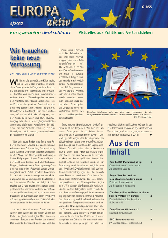 Die neue Ausgabe unserer Mitgliederzeitschrift ist da. In Europa aktiv 4-2012 lesen Sie u.a. Kommentare von EUD-Präsident Rainer Wieland zur Debatte um ein neues Grundgesetz sowie von Generalsekretär Christian Moos zur Diskussion um ein Euro-Parlament. Außerdem finden Sie dort einen Beitrag zu 60 Jahren Europäischer Wettbewerb, einen Bericht zur Wahl des neuen Präsidenten der Europäischen Bewegung sowie viele weitere Kommentare, Beiträge und Berichte aus den Landes-, Kreis-, Stadt- und Ortsverbänden der Europa-Union Deutschland.